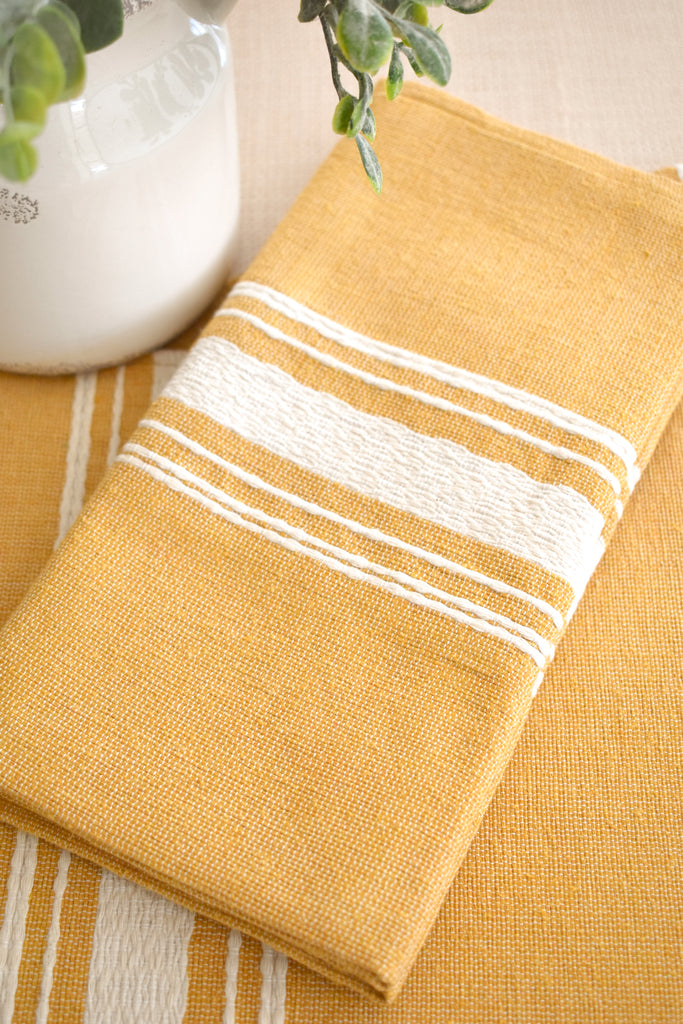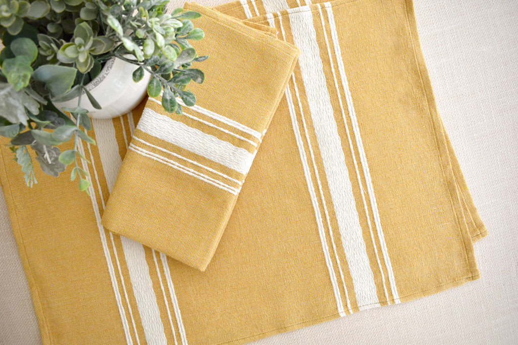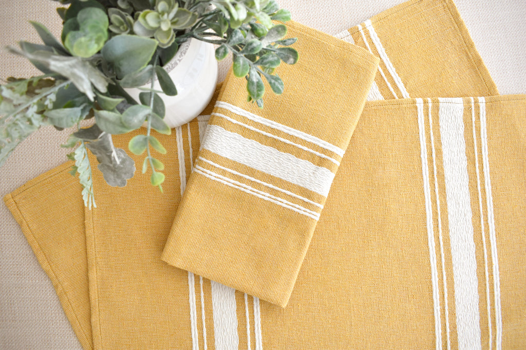 The luscious mustard color on these placemat with its cream embroidery is  a must have in every home. 14.5” x 20”