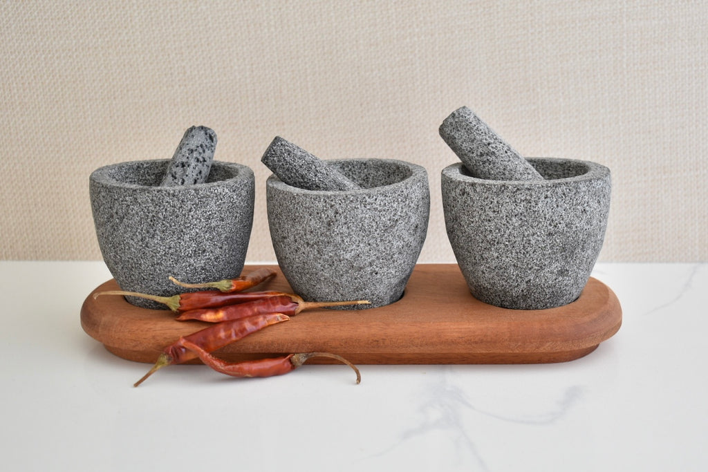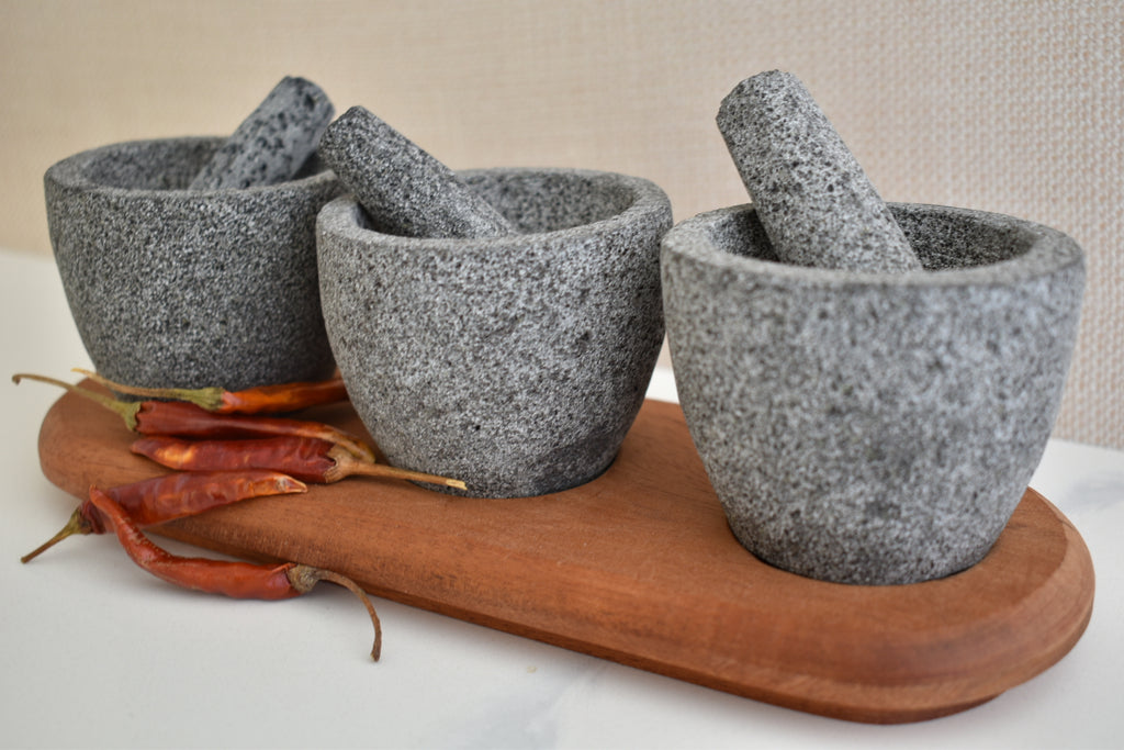 Perfect for different salsas at any gathering. 10 inch wooden base comes with 3- 2.5 inch rock salsa bowls.