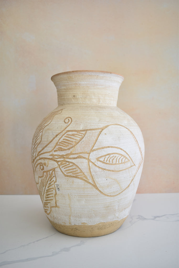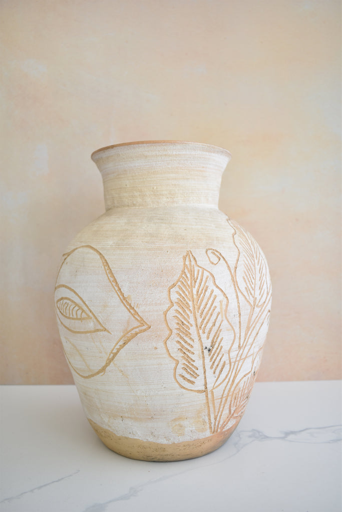 This Beautiful white washed vase with a calla lily design is approximately 13.5” tall.